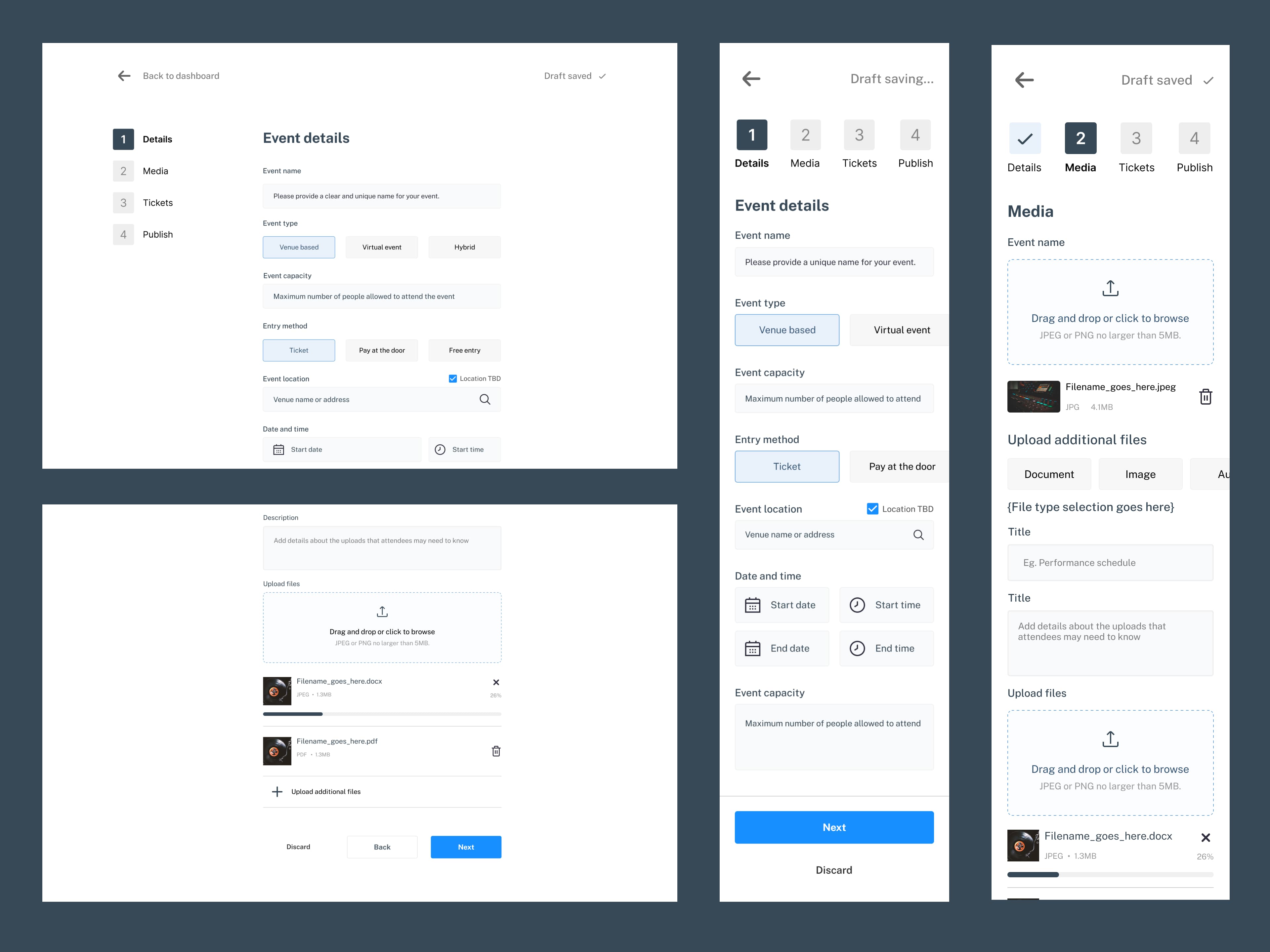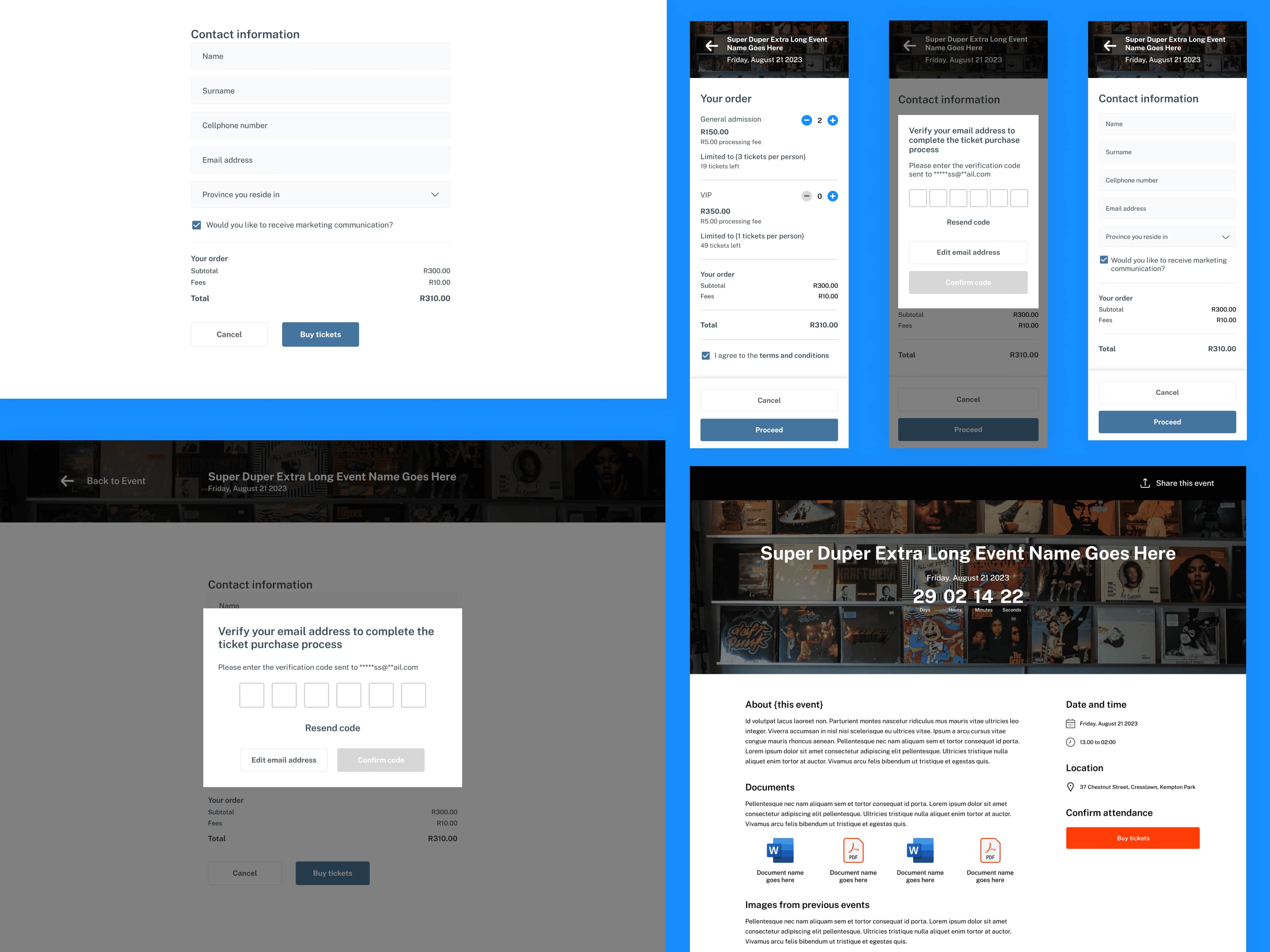 In tandem with the dashboard designs, I was also responsible for creating a front-end view for attendees registering for events, outside the realm of event creation. The event registration pages would pull from the information entered when creating an event and allow attendees to sign up/register for an event and receive confirmation. Designs were created for information entry screens as well as payment and confirmation screens (positive and negative flows).